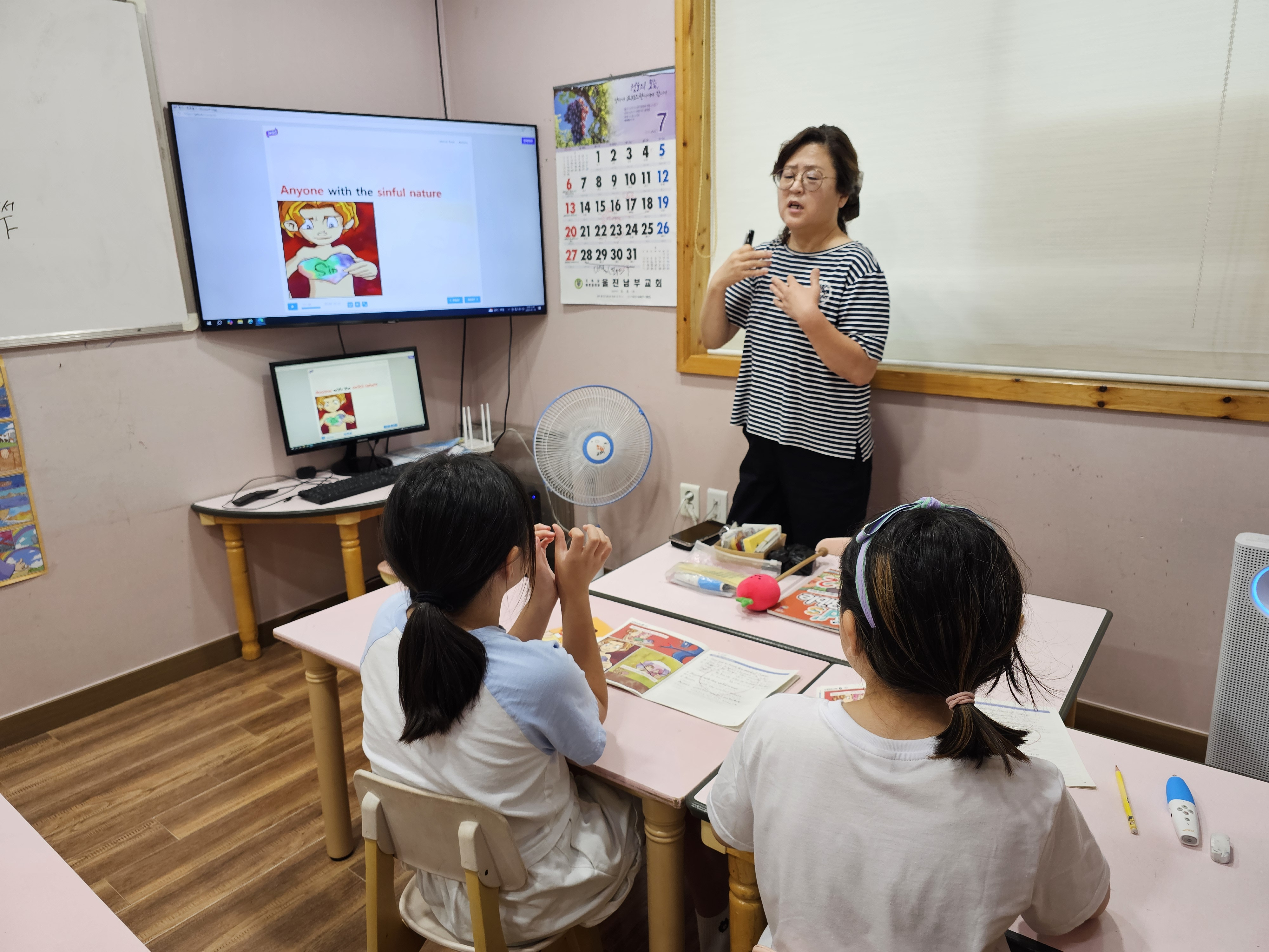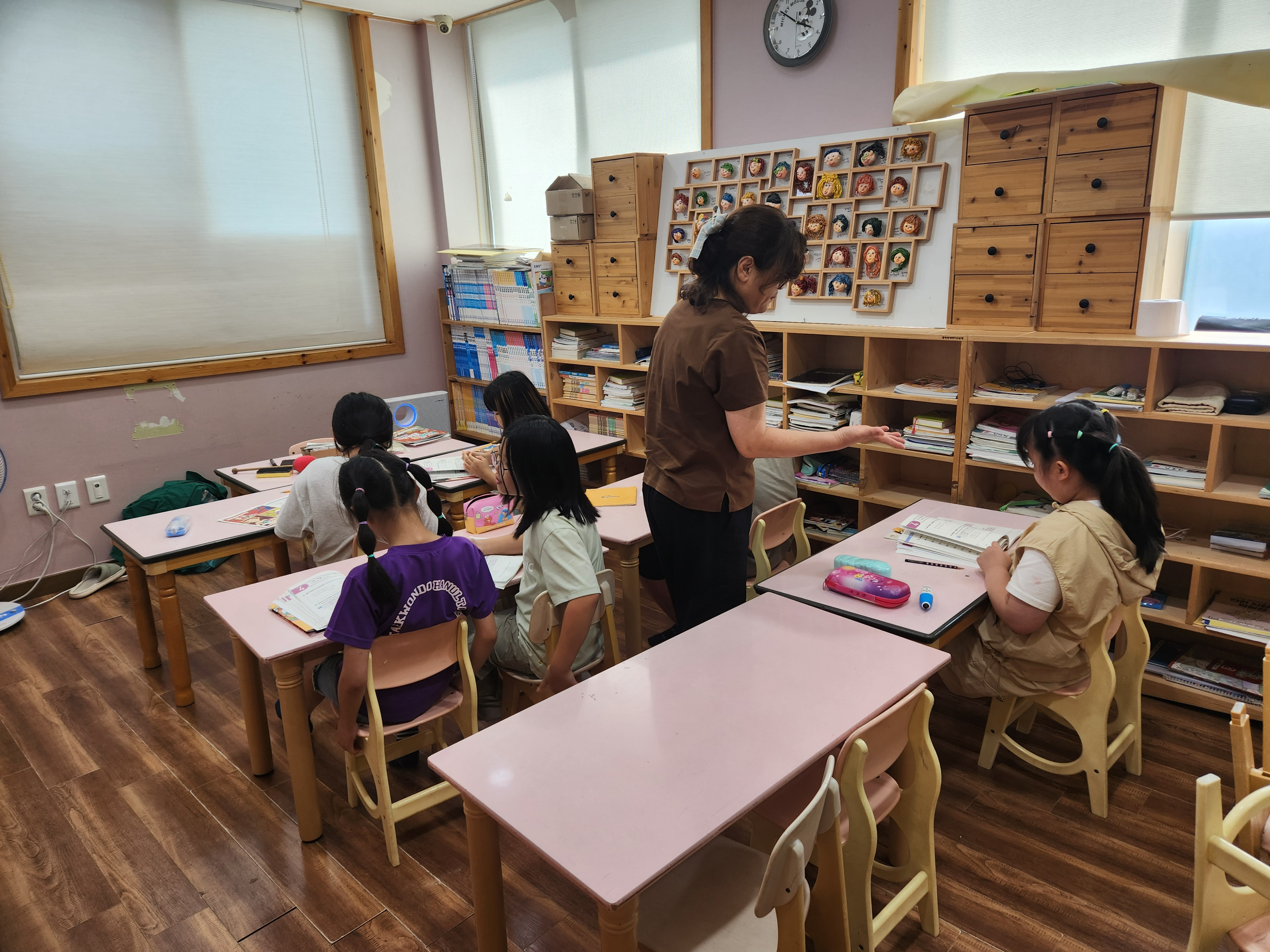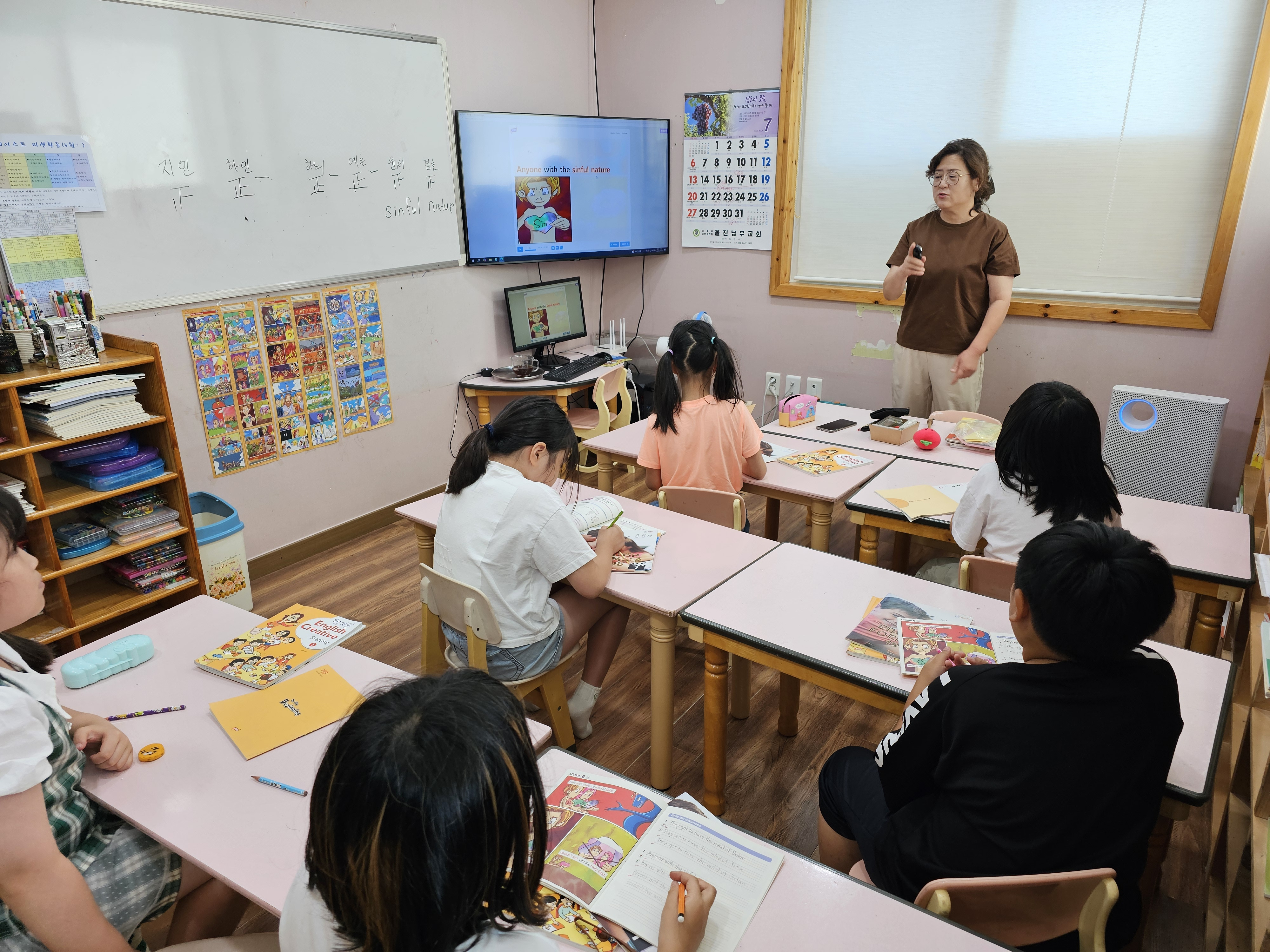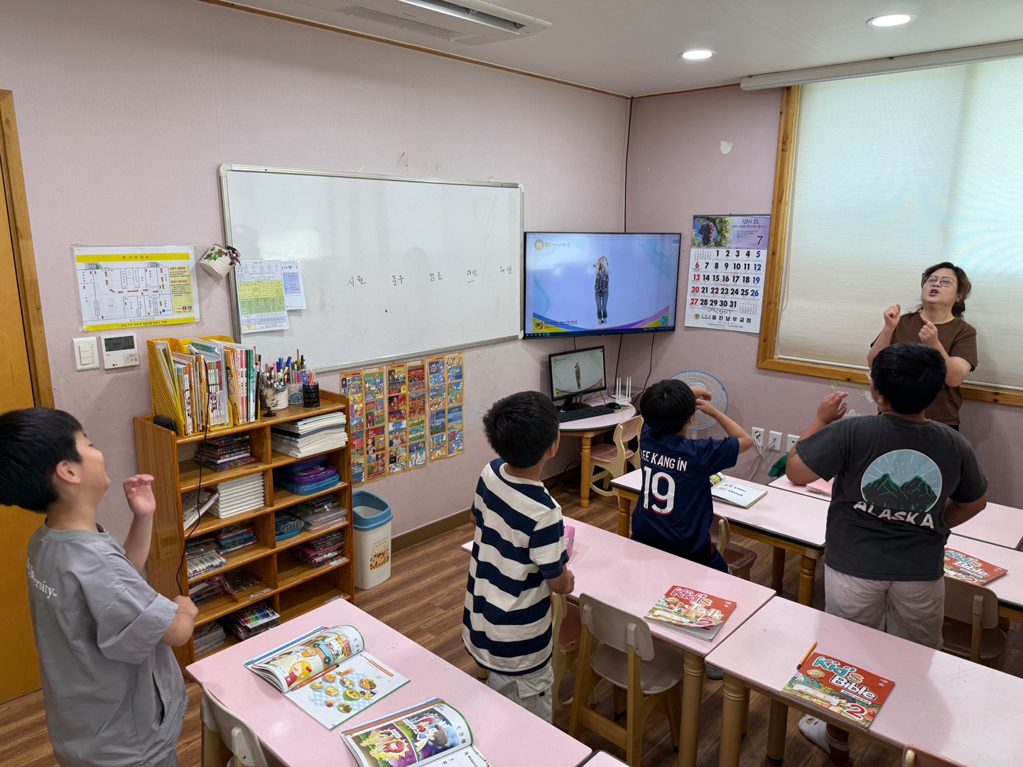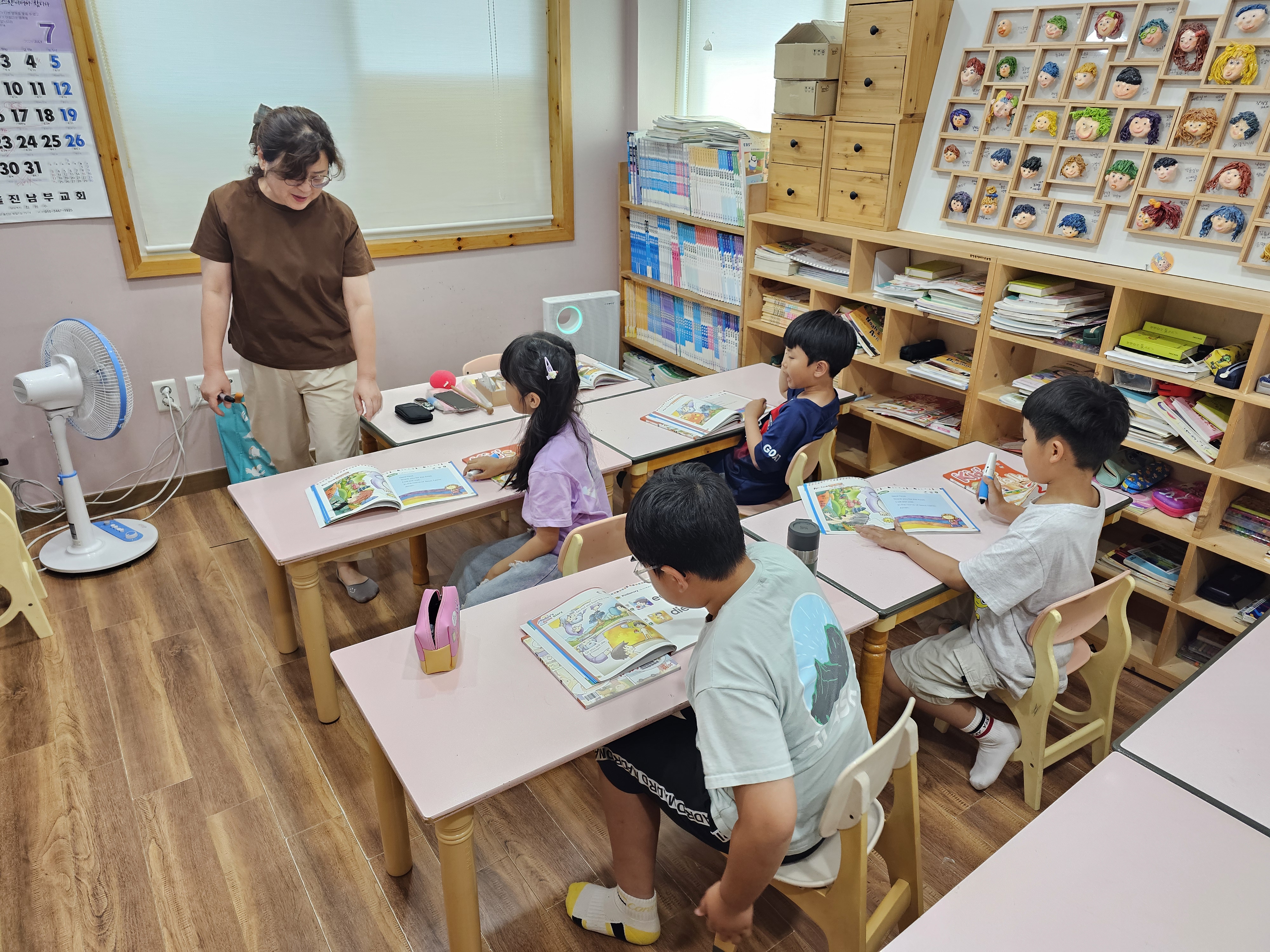 선생님과 같이 영어를 따라 하기도 하고 적으면서 열심히 영어 발음을 익히는 아이들입니다.