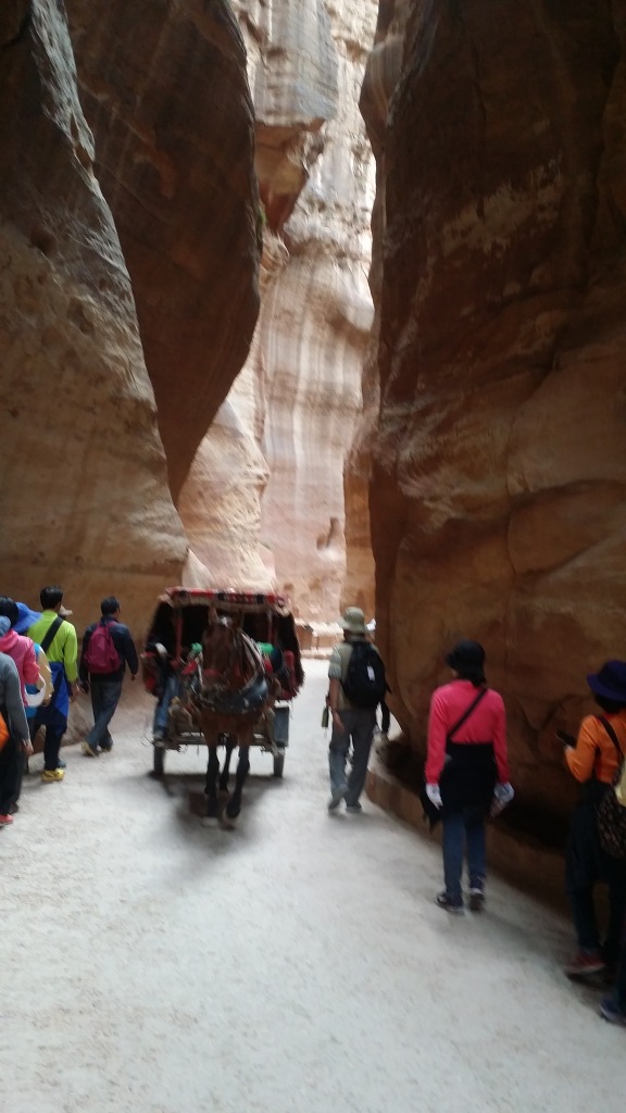 두 마리의 코끼리입니다. 기기묘묘! 여기는 페트라입니다. 1985년 유네스코 세계 문화유산으로 지정되었는데, 그 이후로 이곳에 살던 베두인들이 모두 쫓겨나야 했답니다. 세계 문화유산에 감히 어떻게? 그래서 그들 중의 일부는 여기서 말이나 마차를 끌고 관광객들을 부릅니다. 이 길 시크를 말이나 마차를 타고 다질 수도 있습니다.