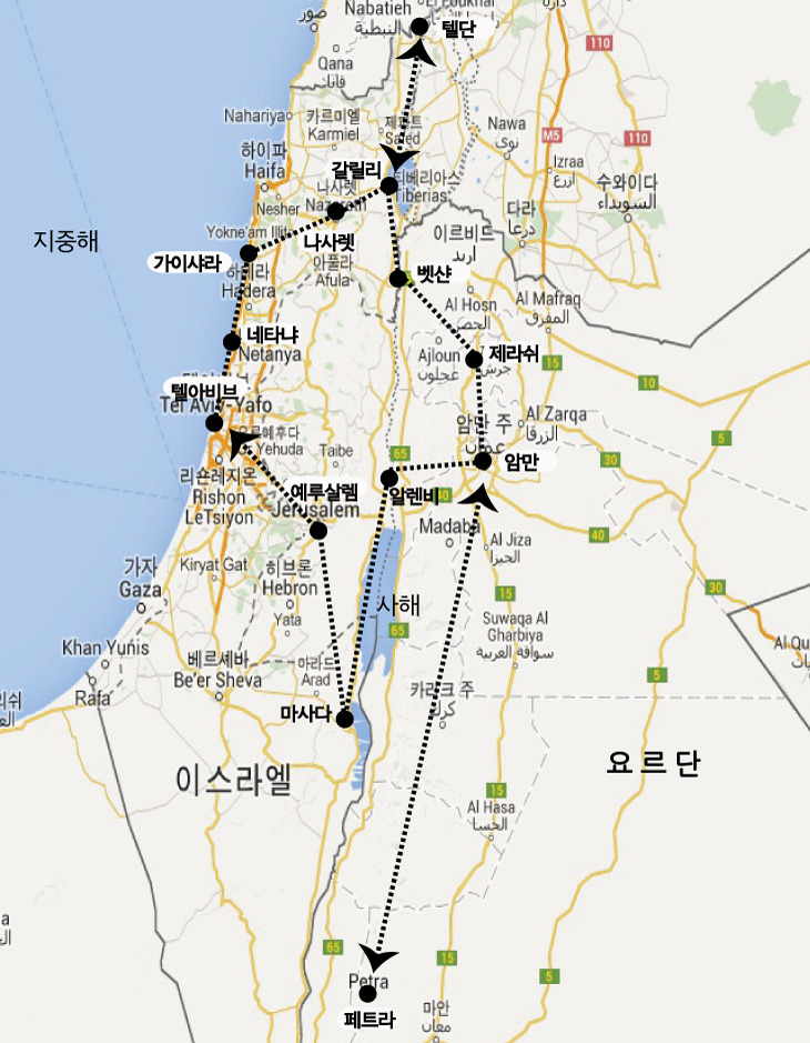 검은색 점선이 우리 순례단의 개략적인 이동을 나타내는데요, 브엘세바는 '베르세바'로 표기가 되었고 거기서 수평으로 이동하면 마사다 직전에 아라드가 있습니다. 그곳에 있는 텔 아라드로 향합니다. 민수기 21장에 보면 모세가 이스라엘 백성을 이끌고 광야에 있다는 소문을 들은 아랏(Arad) 왕이 모세진영으로 다가가서 몇 사람을 포로로 잡아갔습니다. 모세가 가만히 있을 수 없지요. 하나님께 기도하고, 그들을 진멸하고 그곳 이름을 '호르마'라고 했습니다. 호르마는 폐허라는 뜻이지요!