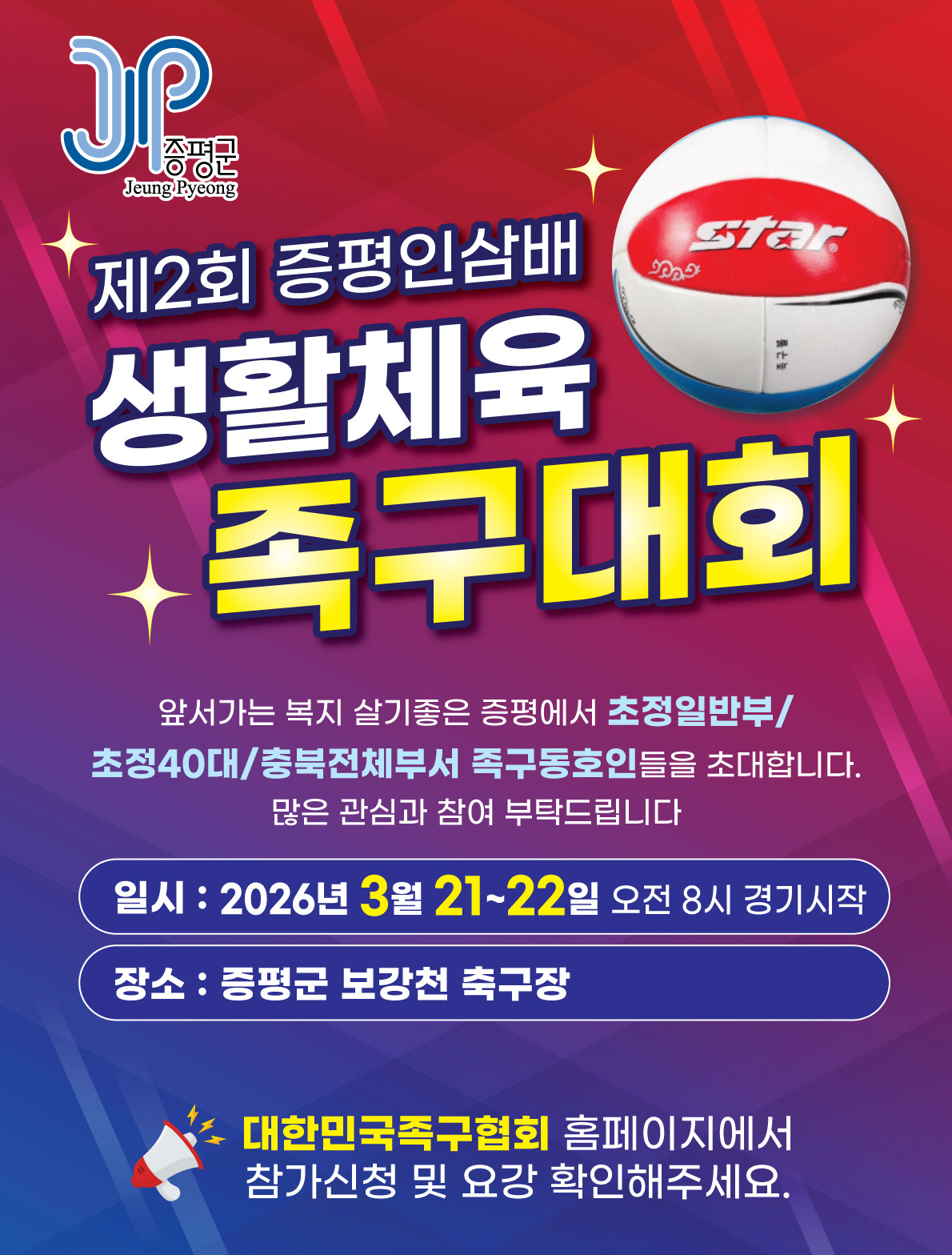 제2회 증평인삼배 생활체육 족구대회 작성자채희대(충청북도전무이사)|작성시간26.03.06|조회수18 목록 댓글 0 글자크기 작게가 글자크기 크게가 안녕 하십니까.충청북도족구협회 전무이사 채희대입니다.제2회 증평인삼배 생활체육 족구대회 3월21일 토요일 (초청일반부/초청40대부)많은 관심과 참여 부탁 드립니다. 다음검색 현재 게시글 추가 기능 열기 북마크 공유하기 신고 센터로 신고 댓글 댓글 0 댓글쓰기 답글쓰기 댓글 리스트