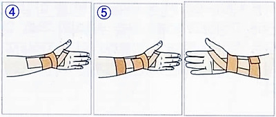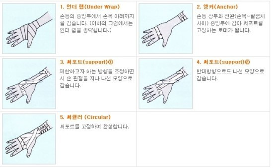 ④ 일자형 테이프(5카)를 손목관절에 가볍게 당겨서 붕대를 감듯이 돌려서 손목부분을 고정시킨다.