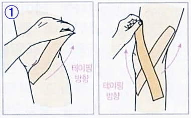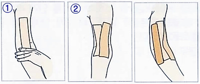 ① 팔꿈치를 45도 정도 구부린 상태에서 일자형 테이프(3칸 반)를 팔 안쪽 위와 아래에 약간 당겨서 부착하고 부드럽게 밑에서 위로 밀러서 붙인다.