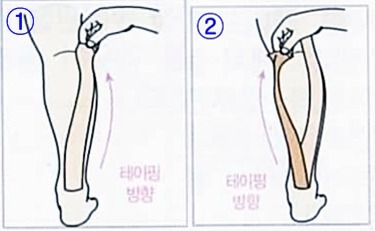 ③ 일자형 테이프(10칸)를 무릎(슬관절) 하단부에 붕대를 감듯이 돌려서 붙여 고정한다.
