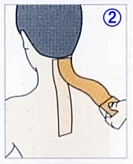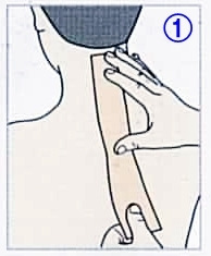 ① 일자형 테이프(4칸)를 고개를 약간 숙인 상태에서 경추라인을 따라 붙이되 경추(시작과 끝) 부위에서는 당겨서 붙이고 그 후(흉추)부터는 자연스럽게 붙힌다.