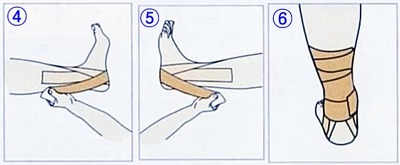 ⑥ 일자형 테이프(14칸)를 발목 관절에서 시작하여 발목 위쪽을 향하여 자연스럽게 편안하게 붕대 감듯이 돌려서 고정한다