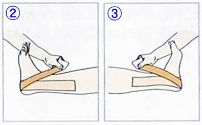 ③ Y자형 테이프(4칸)의 절개되지 않은 부분을 종아리 내측에 고정하고 절개된 부분을 종아리 상하로 적당한 간격으로 벌려서 붙여 고정한다.
