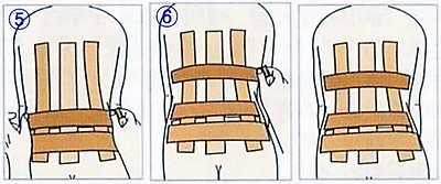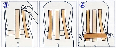 ① 상체를 45도 정도 구부리고 일자형 테이프(4칸)를 가로로 붙이되 통증 부위(척추통과부위)는 당겨서 붙힌다.