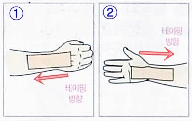 ① 일자형 테이프(2칸 반)를 손등 중간부분에 고정시키고 손목관절 통과시에는 당겨서 붙이면서 나머지 부분은 자연스럽게 붙인다.