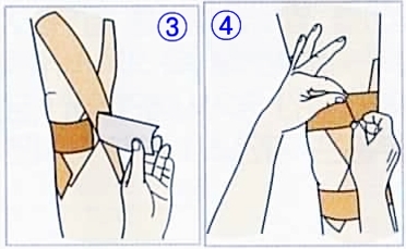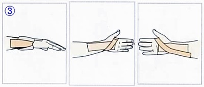 ③ Y자형 테이프(4칸)의 절개되지 않은 부분을 손목의 손날쪽 부분에 고정하여 가볍게 당겨서 붙이고 절개된 부분 중 한쪽은 손바닥을 가로질러 고정시키고 나머지 부분은 손등을 가로질러 고정시킨다.