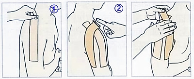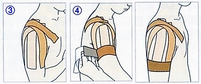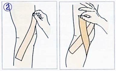 ① 일자형 테이프(4칸 반)를 팔(상완부) 옆면 중앙 위치에 고정하고 어깨위로 향하여 붙이되 어깨 관절 통과시에만 당겨서 붙히고 나머지 부분은 자연스럽게 붙힌다.