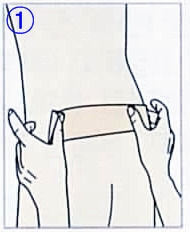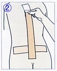 ② 일자형 테이프(6칸)를 요추 하단부에 고정하고 척추방향을 따라 위쪽으로 붙이되 통증부위는 당겨서 붙이고 나머지 부분은 자연스럽게 붙인다.