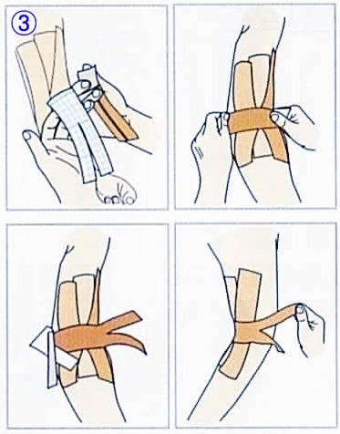 ③ H자형 테이프(6칸)를 팔꿈치 전면부 중앙 부위에 당기면서 가로로 붙히고 절개된 양측 두개의 테이프를 팔꿈치의 상단부 위와 하단부위에 가졉게 돌려서 붙인다.