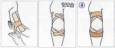 ④ 일자형 테이프(10칸)를 무릎(슬관절) 상단부에 붕대를 감듯이 돌려서 붙여 고정한다.