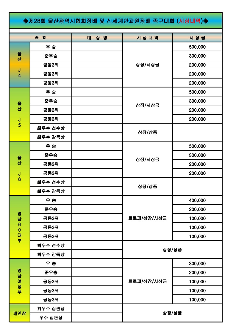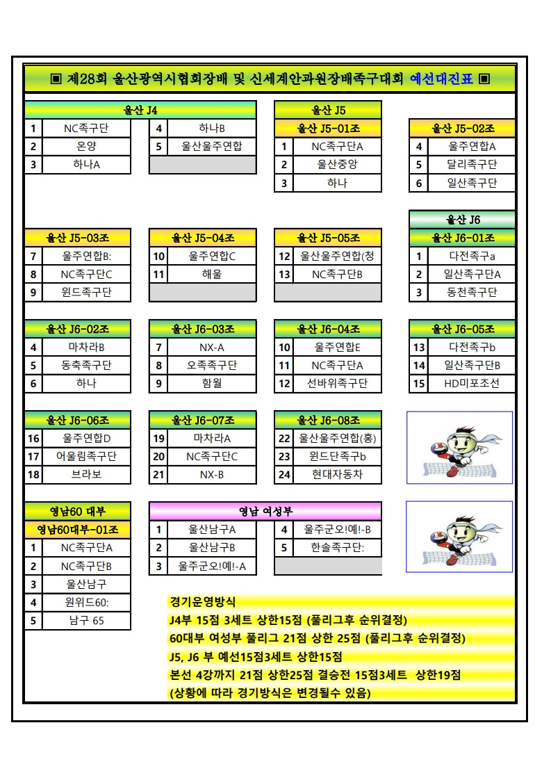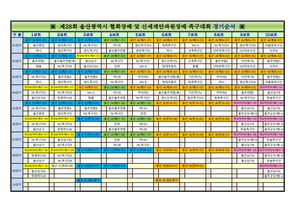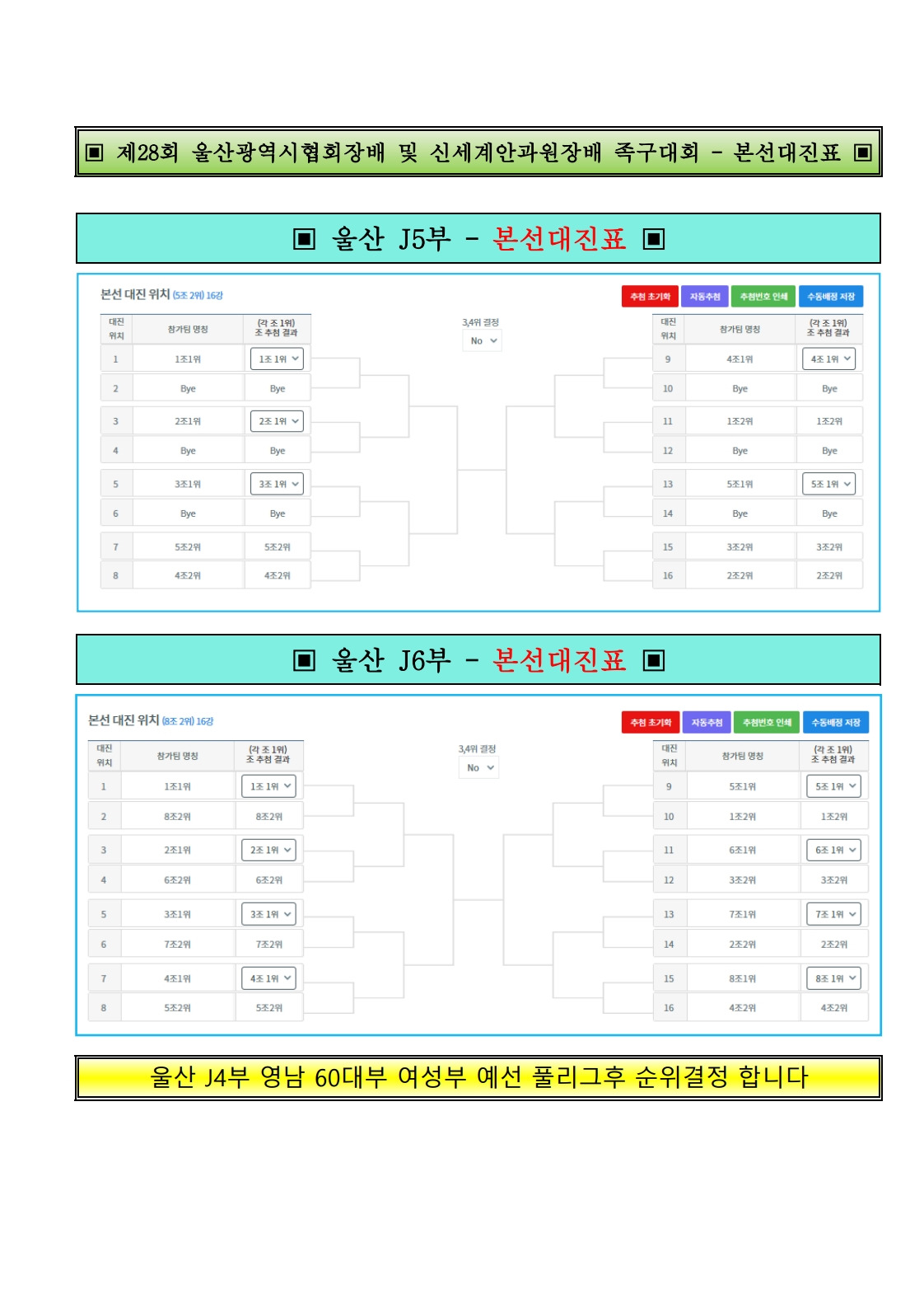 제28회 울산협회장배 및 신세계안과원장배 족구대회 예선및 본선 대진표 작성자황정갑|작성시간25.10.21|조회수218 목록 댓글 0 글자크기 작게가 글자크기 크게가 다음검색 현재 게시글 추가 기능 열기 북마크 공유하기 신고 센터로 신고 댓글 댓글 0 댓글쓰기 답글쓰기 댓글 리스트