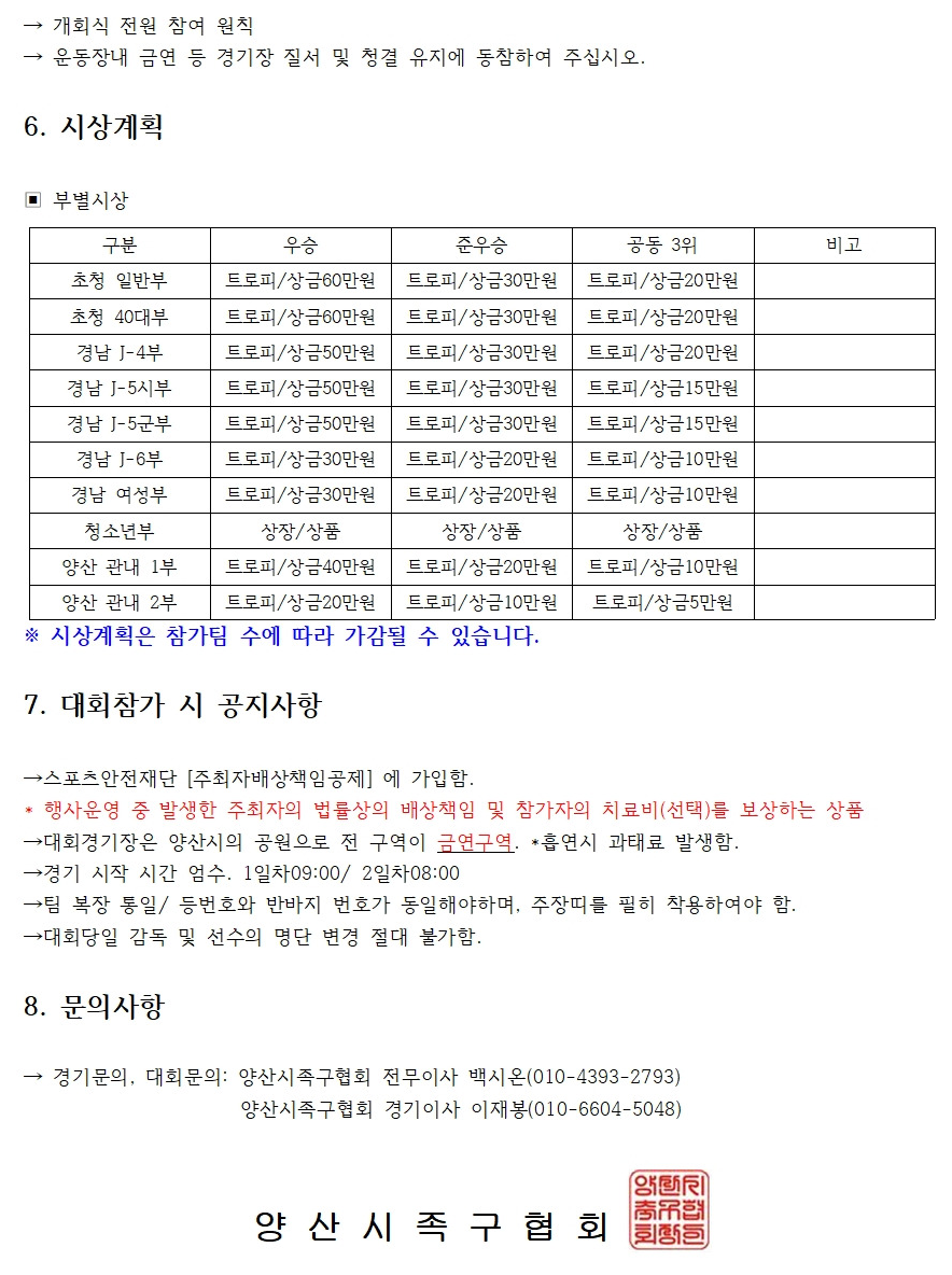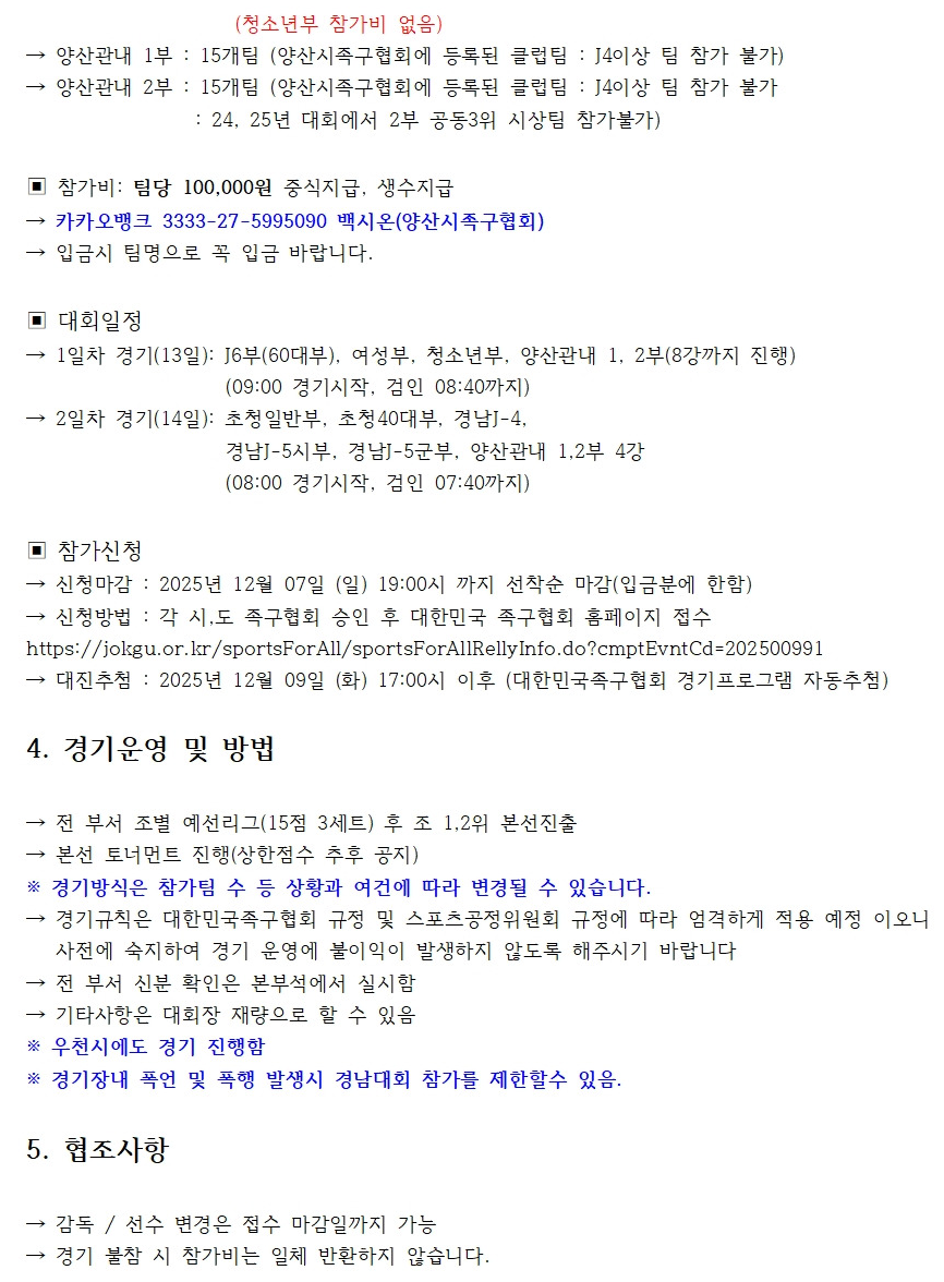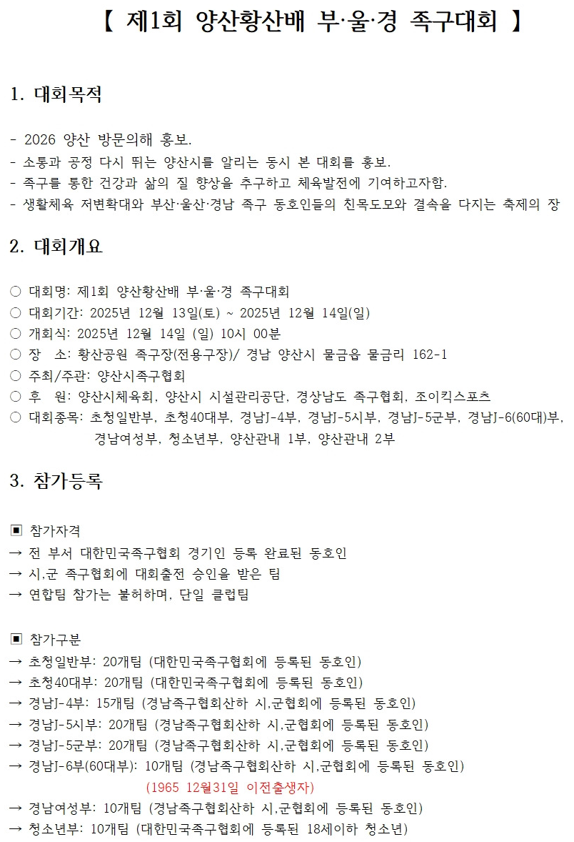 대회홍보 제 1회 양산황산배 부울경 족구대회 대회요강 작성자양산시족구협회 이재봉 경기이사|작성시간25.11.19|조회수101 목록 댓글 0 글자크기 작게가 글자크기 크게가 다음검색 현재 게시글 추가 기능 열기 북마크 공유하기 신고 센터로 신고 댓글 댓글 0 댓글쓰기 답글쓰기 댓글 리스트