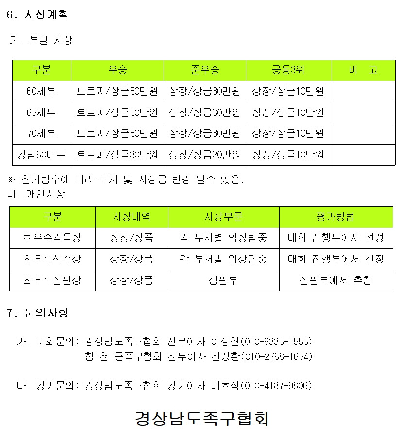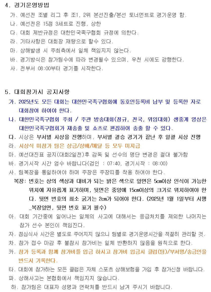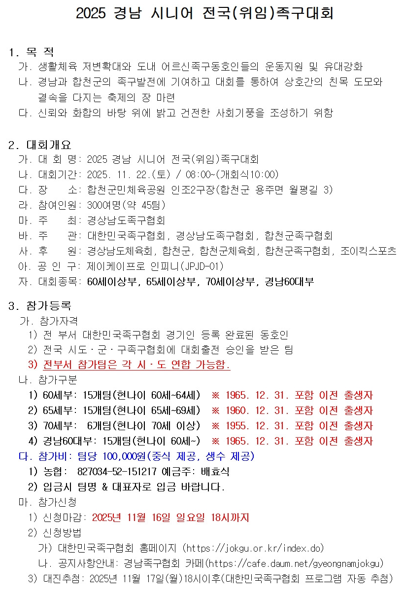 2025 경남 시니어 전국(위임) 족구대회 알림(수정공지) 작성자배효식(경남경기이사)|작성시간25.11.04|조회수65 목록 댓글 0 글자크기 작게가 글자크기 크게가 다음검색 현재 게시글 추가 기능 열기 북마크 공유하기 신고 센터로 신고 댓글 댓글 0 댓글쓰기 답글쓰기 댓글 리스트