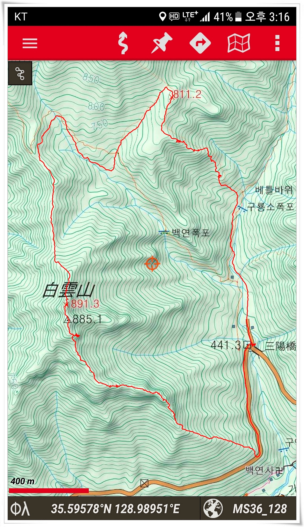 1.산행구간: 삼양교-용수골-전망대-x811m-백운산-삼양교