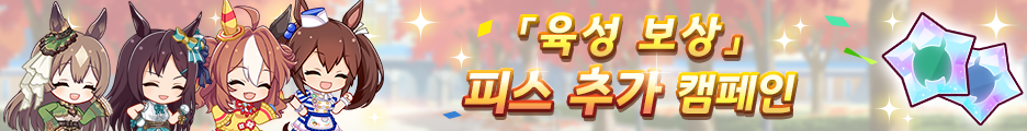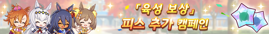 - 피스 추가 캠페인: 과거 미개최 캠페인의 우마무스메 피스 분량을 포함하여 평소의 2배만큼의 피스를 획득할 수 있습니다.