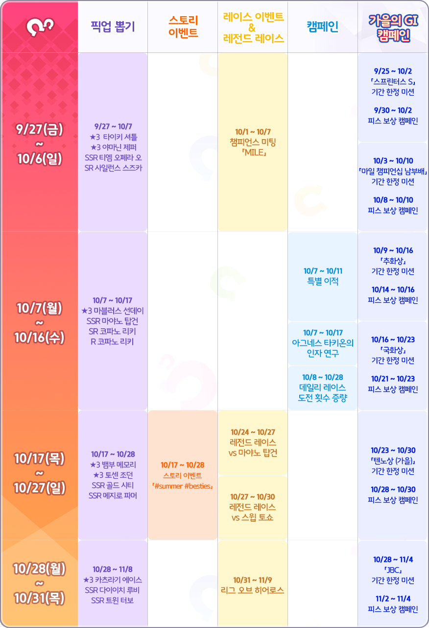 우마무스메 프리티 더비 10월 스케줄을 안내드립니다.