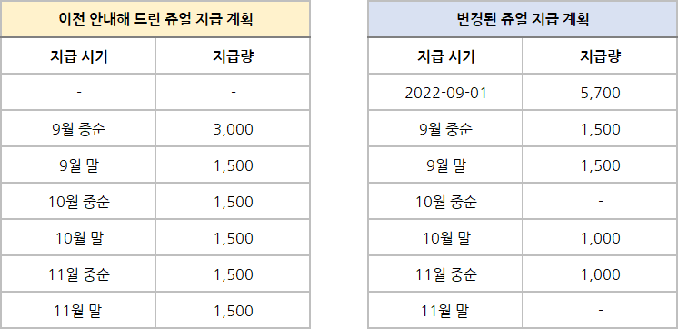 저희는 9월 중순부터 쥬얼을 나눠서 지급해 드리는 기존 일정을 유지하고자