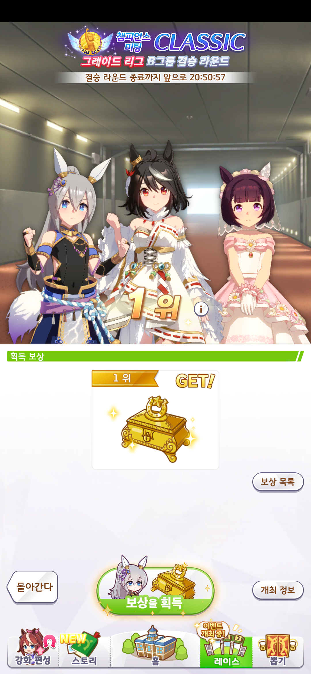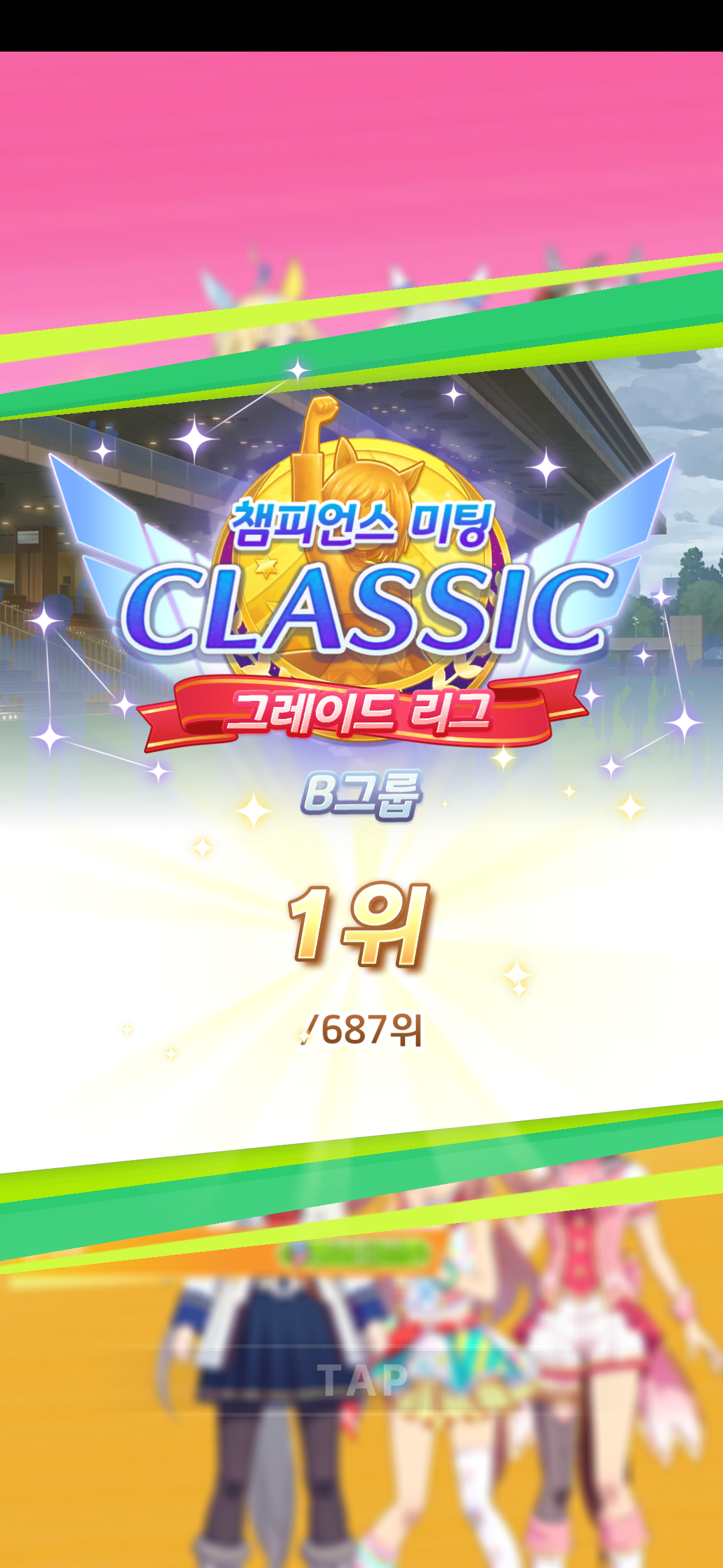 A그룹 한 번도 간 적 없고, B그룹도 한섭 초창기 캔서버에서 1착 한 이후에는 항상 밑에서 깔아주는 무과금 유저였는데, 처음으로 Ms VICTORIA 제 우마무스메가 올라가서 센터로 봤네요.