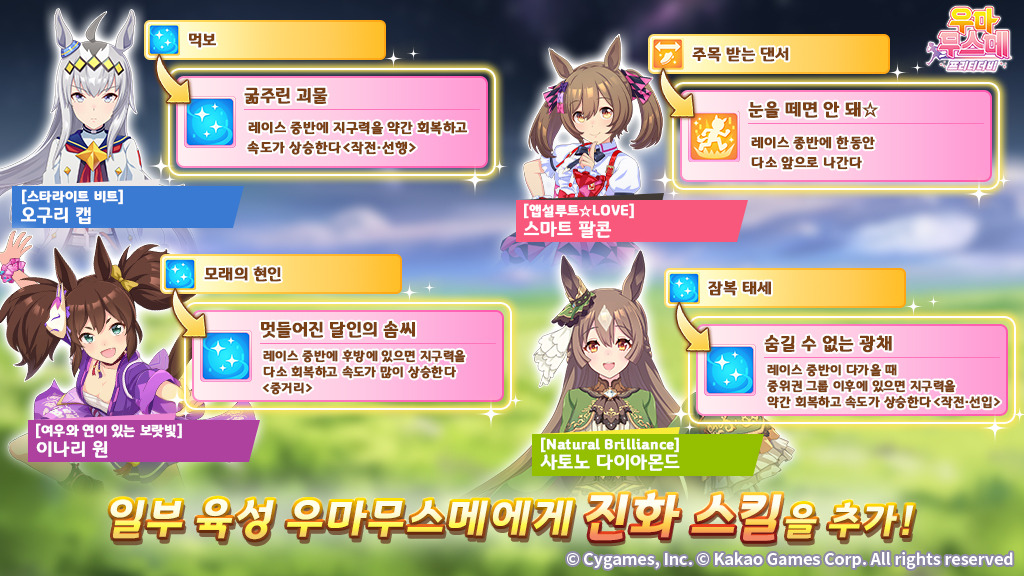 - 대상 육성 우마무스메와 추가된 신규 진화 스킬은 아래와 같습니다.