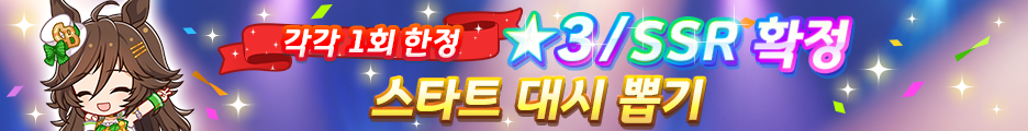 - [★3 확정 스타트 대시 뽑기 제2 R]과 [SSR 확정 스타트 대시 뽑기 제2 R]에서는 육성 우마무스메 교환 Pt 및 서포트 카드 교환 Pt를 획득할 수 없습니다.
