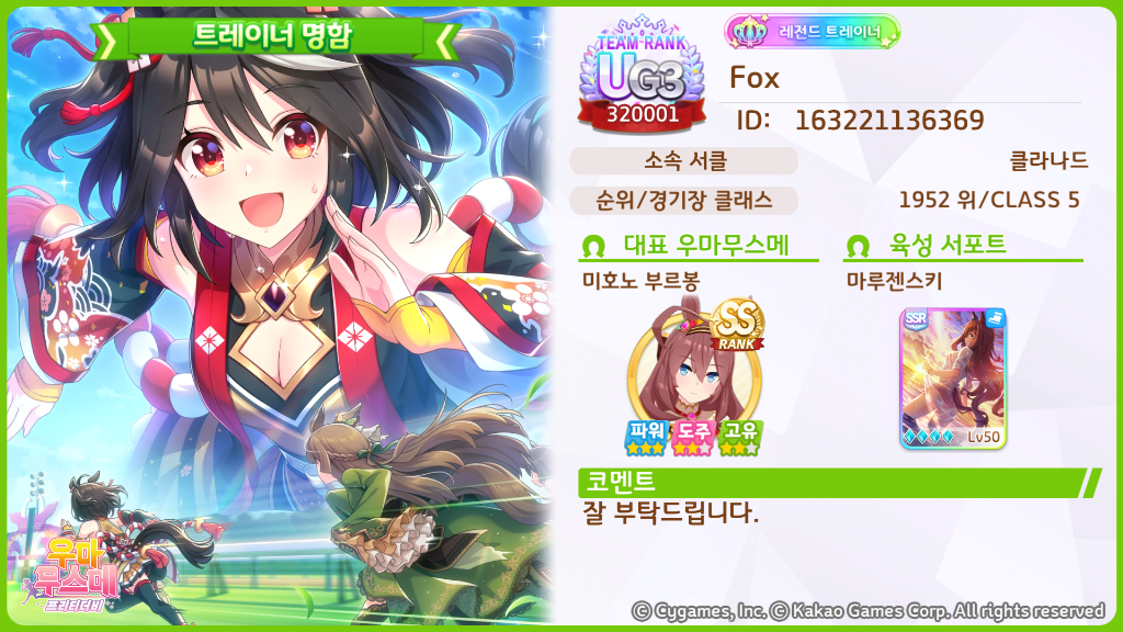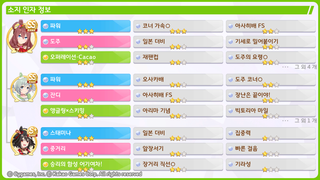 3. 인자 및 서포트 카드 소개(필수): 도주 육성에 필요한 서폿카드인 마루젠스키 카드와 각종 도주용 스킬인자를 가지고 있는 대여말입니다.