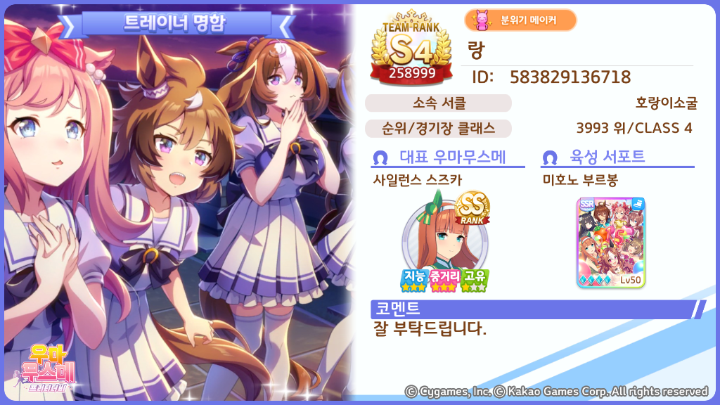 * 대표 우마무스메와 서포트 카드가 변경될 경우 이벤트 참여 글에도 함께 변경해 주셔야 참여로 인정됩니다.