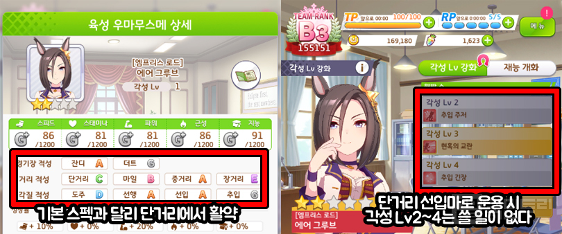 다만, 이 스킬을 보고 곧바로 각성하는 건 금물이다. 육성 시나리오라면 몰라도 팀 레이스나 레전드 레이스 같은 콘텐츠에서는 적성과 실전에서 활약하는 종목이 다른 경우가 많아서다. 대표적인 예시가 ‘에어 그루브’다. 중거리 선행마로 설계됐지만, 팀 레이스에서는 단거리 선입마로 쓰는 것이 가장 강력하다. 이렇다 보니 기껏 각성해도 꿔다놓은 보릿자루 신세가 될 수도 있다.