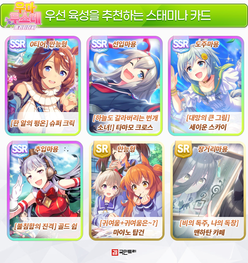 SR ‘마야노 탑건’과 ‘맨하탄 카페’도 나쁘지 않다. SSR 카드를 수집하지 못했다면 투자할 대상이다. 마야노 탑건은 초기 우정도 증가 옵션이 없어 인연 게이지 쌓기가 무척 힘들지만, 스탯 범핑 효율은 SSR 카드 못지않다. 맨하탄 카페는 장거리 주자 전용 카드다. 전반적으로 무난한 성능이며, 장거리 주자 육성 시 스태미나 카드가 부족하다면 꽤 괜찮은 선택지다.