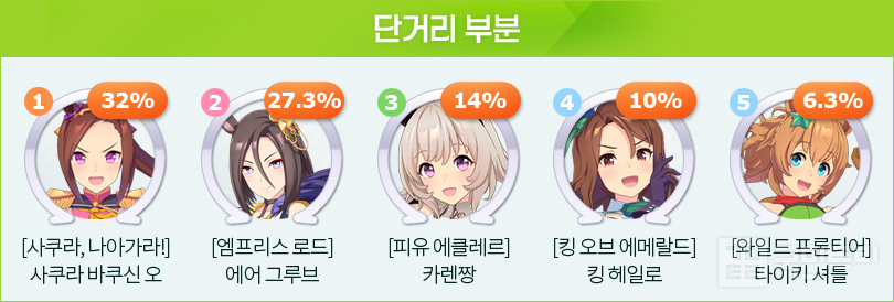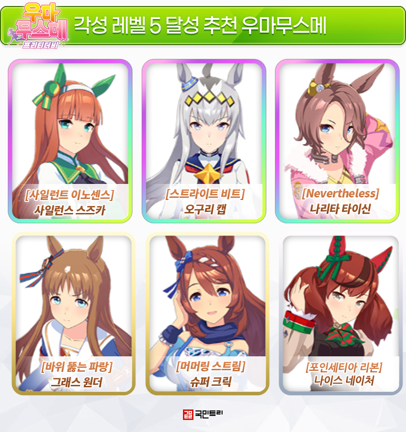 먼저 각성 5레벨 추천 우마무스메는 위 이미지의 여섯 명이다. ‘사일런스 스즈카 – 그래스 원더 – 나이스 네이처’는 마일과 중거리 부문에서 꾸준히 픽률 TOP 2~3위를 기록 중이다. 각성으로 개방하는 스킬과 적성이 딱 맞아떨어져 투자 효율이 높다.