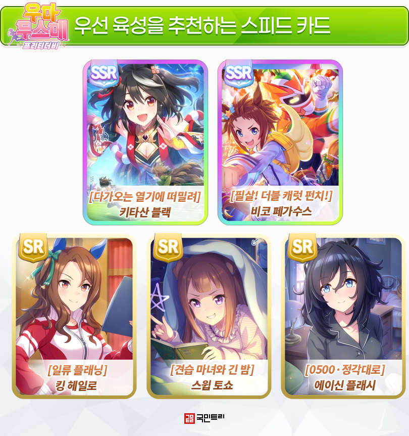 스피드 카드는 선택지가 매우 넓고 편성 비중도 높지만, SSR ‘키타산 블랙 – 비코 페가수스’에 투자하는 게 1순위다. 트레이닝 효율과 특기율이 모두 높은 카드이며, 해외 서버에서는 스탯 고점을 높이기 좋은 것으로 유명하다. 비코 페가수스의 스킬이 단거리, 마일 중심인 것 정도는 무시해도 좋을 정도다.
