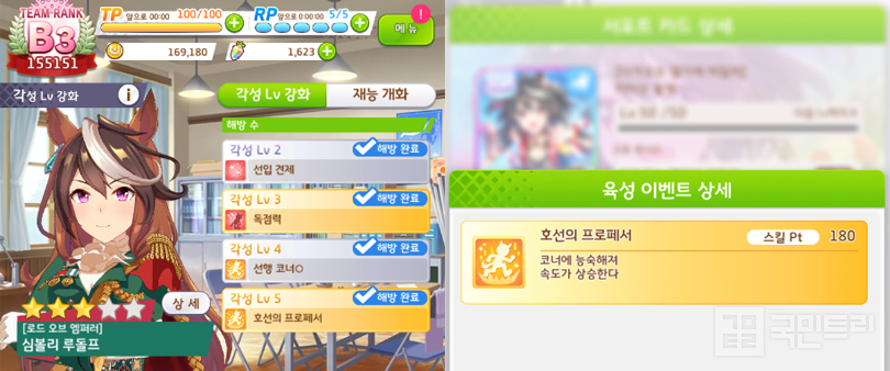 ‘심볼리 루돌프’는 앞서 언급한 내용과 같다. 현 메타의 서포트 카드 편성은 일단 키타산 블랙을 넣고 남은 카드를 생각하는 게 기본이다. 따라서, 굳이 각성 5레벨을 달성하지 않아도 호선의 프로페서는 배울 수 있다. 게다가 각성 4레벨에 배우는 스킬이 ‘선행 코너’인데, 그녀는 선입마라 배울 일이 없다. 스킬 Pt를 아껴서 고점을 노리는 게 아니라면, 일단 각성은 3레벨에서 잠시 멈추자.