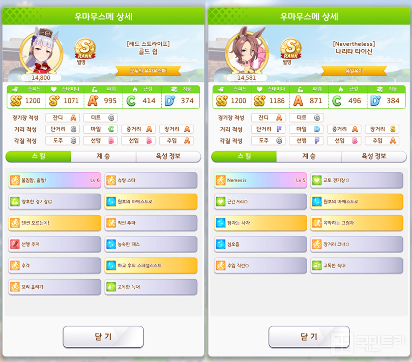 더불어 세팅을 확인하던 중 의외의 사실을 발견했습니다. 중, 장거리 선행마 라이스 샤워와 나리타 브라이언이 모두 스태미나 이터를 배웠더군요. 장거리 경기용 디버프 스킬로, 경기 중반에 후방에 있다면 전방 우마무스메의 지구력을 아주 조금 빼앗습니다. 상황에 따라 포지션을 바꾸는 건지, 아니면 스킬 포인트가 남았던 건지 궁금하군요.