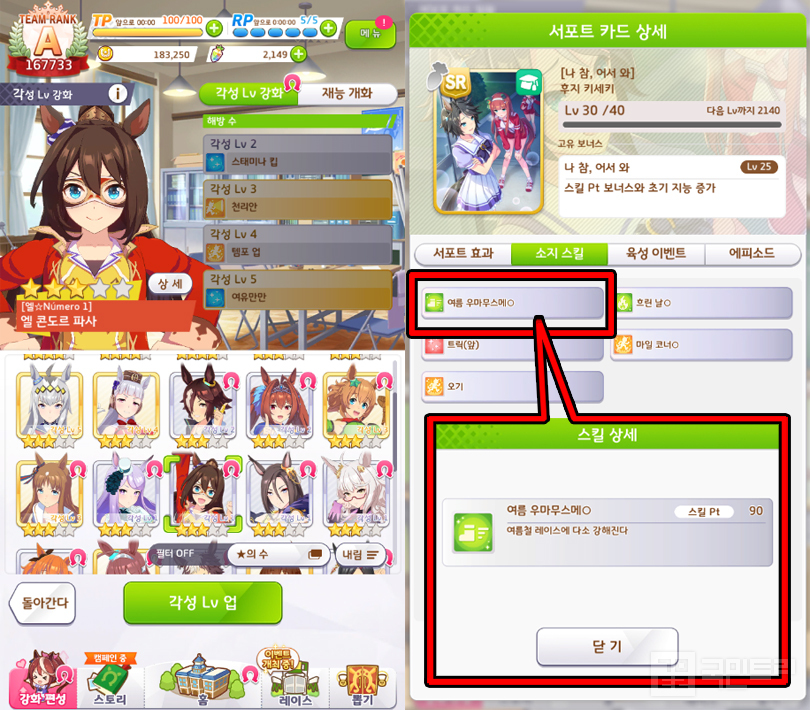SR, R등급 서포트 카드 ‘후지 키세키’도 기억해두길 바랍니다. 패시브 스킬 여름 우마무스메를 가르쳐주는 유일한 카드죠. 캔서배 주자에게 가르치면 스피드가 조금 상승하며, 터다지기의 발동 조건을 채우는 데 도움이 됩니다.