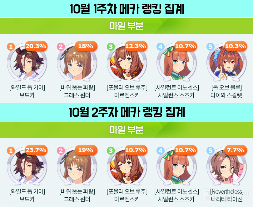 ‘우마무스메 프리티 더비’ 메카 랭킹 시간입니다. 이번 주 천상계는 상위권에 다시 표가 몰렸습니다. 이런 와중에 중거리와 더트 5위가 그래스 원더와 하루 우라라로 변했죠. 전자는 오픈 초반부터 마일에서 인기를 끌었고, 9월부터 중거리 채용 시도가 조금씩 늘고 있었습니다. 그리고 마침내 TOP 5에 입성했네요. 하루 우라라는 트레이너들의 스펙이 상승하자 차츰 잊혀졌으나, 마르젠스키의 지분이 감소함에 따라 0.3% 포인트차로 역전에 성공했습니다.