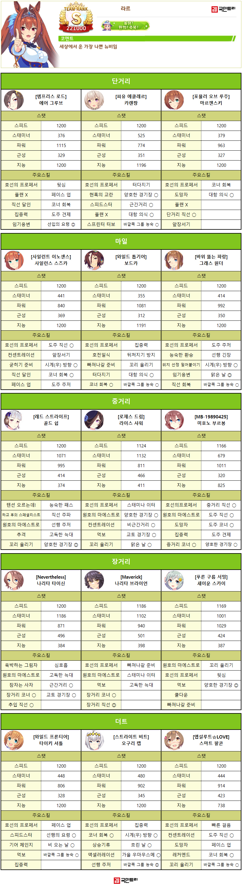포인트는 ‘추입 – 선행 – 도주’ 조합의 중장거리입니다. 놀랍게도 장거리 주자로 유명한 골드 쉽과 라이스 샤워를 중거리로 보냈죠. 골드 쉽을 중거리에 배치한 건 나리타 타이신과 포지션이 겹치는 걸 피하기 위해서입니다. 팀 레이스는 각 경기에서 포인트를 많이 벌어야 순위기 상승하니까요. 따라서, 조원의 각질을 저마다 다르게 배치해 베스트 포지션 점수를 노리는 것이 정석입니다.