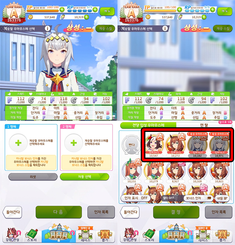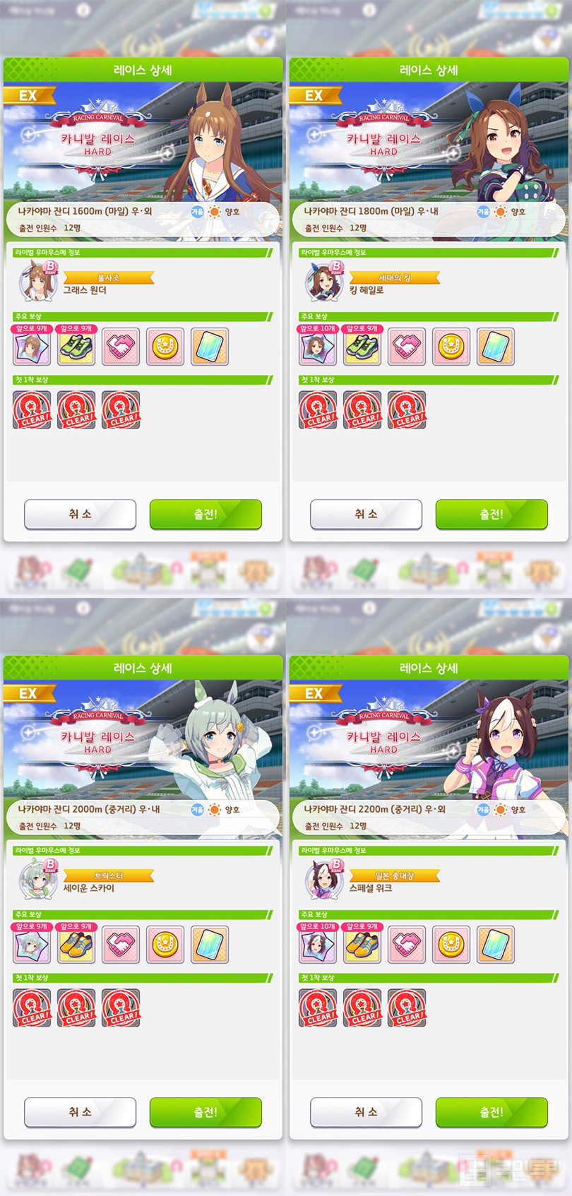 각 우마무스메들을 상대로 1착을 목표로 하자. 카니발 포인트 보상이 가장 후하기도 하지만, 첫 1착 보상으로 쥬얼 150개를 지급하기 때문이다. 이 외에도 프렌드 포인트, 머니, 서포트 Pt, 거리별 운동화와 각 우마무스메 피스를 최대 10개까지 획득할 수 있다. 모든 우마무스메들의 육성 등급은 B로 중거리, 마일 우마무스메를 A등급까지 육성했다면 별다른 문제없이 1착을 따낼 수 있다. 가장 추천하는 우마무스메는 ‘[스타라이트 비트] 오구리 캡’이다. 마일, 중거리 육성이 가능하고 적성까지 폭넓어 초보라도 손쉽게 육성할 수 있다.
