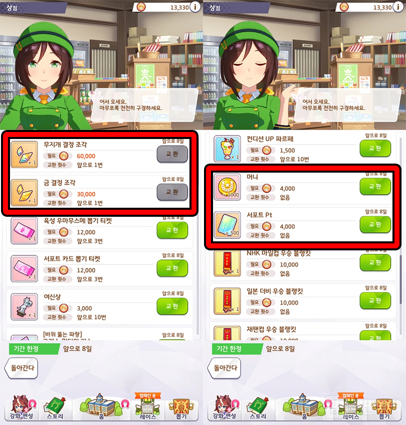 한정 상점에서는 ‘무지개 결정 조각’, ‘금 결정 조각’을 각 1개씩 교환할 수 있다. 해당 조각을 20개씩 모으면 SSR, SR 서포트 카드를 상한 돌파할 수 있다. 이번 기회를 놓치면 그만큼 결정을 만들 시간이 오래 걸리는 셈이다. 이외에 뽑기 티켓을 각 3개, 여신상을 10개까지 교환 가능하다.