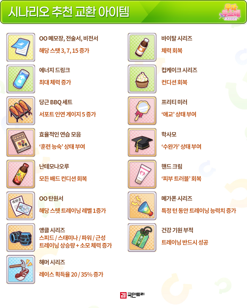 이외에도 소모 체력은 증가하지만 트레이닝 시 추가로 스탯이 상승하는 앵클 시리즈와 일정 턴 트레이닝 능력치를 높이는 메가폰도 괜찮은 아이템이다. 그리고 여유가 된다면 사용 즉시 스탯을 증가시키는 메모장, 전술서, 비전서도 코인 보유량에 따라 구매하면 좋으니 참고하자.