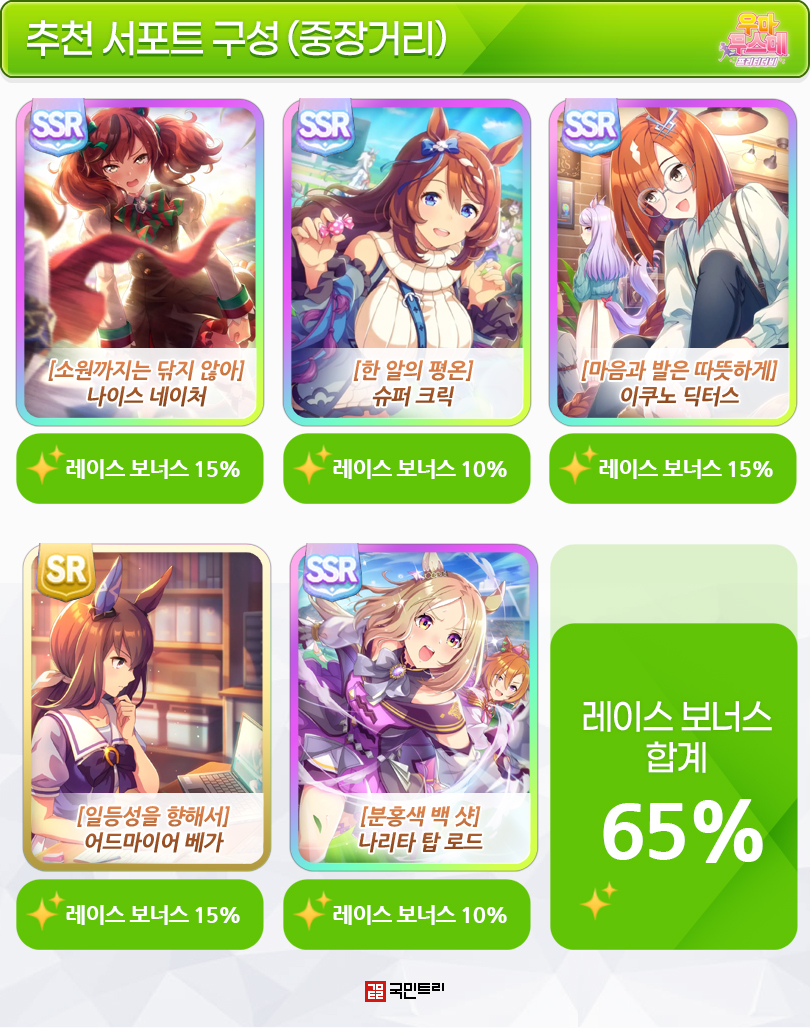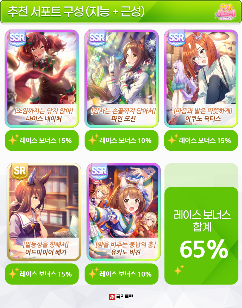 상기 이미지 구성은 친구 서포트를 제외한 5장만으로 무려 레이스 보너스 65%를 달성할 수 있다. 파인 모션을 통해 ‘스피드스터’ 힌트 입수도 가능하다. 중장거리를 제외한 대부분의 우마무스메 육성에 활용할 수 있으며, 나이스 네이처를 통해 선입 전용 레이스 종반 가속기 ‘능숙한 환승’ 힌트도 획득할 수 있다.