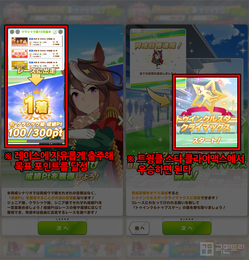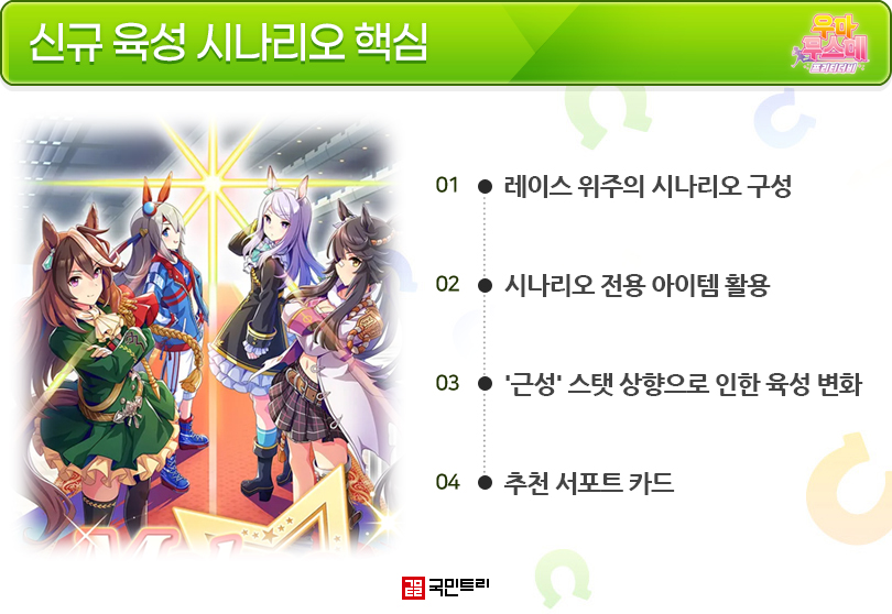 ‘우마무스메 프리티 더비’가 1주년과 함께 신규 육성 시나리오 ‘Make a new track! ~클라이맥스 개막~(이하 클라이맥스)’을 추가했다. 게임의 3번째 육성 시나리오로, 이전에 나온 URA, 아오하루배와 완전히 다른 육성법을 제시했다. 먼저 등장한 해외 서버에선 ‘레이스 보너스’ 효과를 지닌 서포트 카드들의 평가가 급상승했으며, 1주년 밸런스 패치를 통해 상향된 근성 스탯의 새로운 능력과 맞물려 서포트 카드 구성 방향도 많이 달라졌다. 이에 국민트리가 국내 유저들의 안정적인 정착을 돕기 위해 신규 시나리오 클라이맥스의 상세 정보, 추천 서포트 카드 정보를 정리했다.