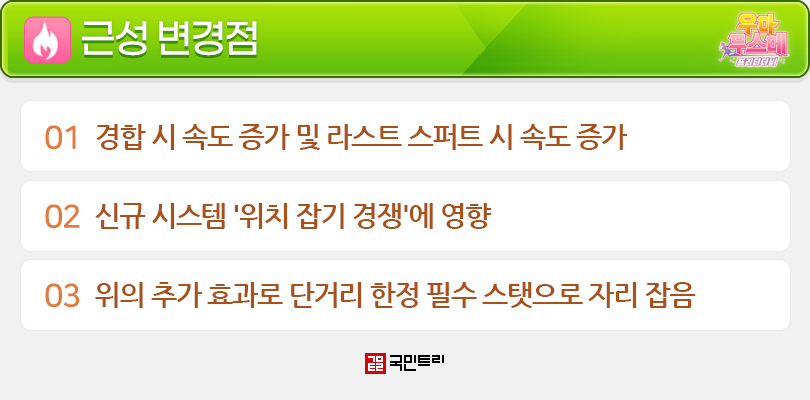 육성법도 많이 바뀐다. 지금까지는 스피드, 지능 서포트 카드가 우선이었지만, 패치 후엔 ‘4근성 – 1지능(이하 4근 1지)’이란 극단적인 육성법이 가능해진다. 하지만, ‘4근 1지’를 위해선 특정 서포트 카드가 꼭 필요해 진입장벽은 높다. 그리고 근성이 좋아진 건 사실이지만, 스피드나 지능을 완전히 대체하는 수준은 아니기 때문에 무작정 근성만 트레이닝하는 건 추천하지 않는다.
