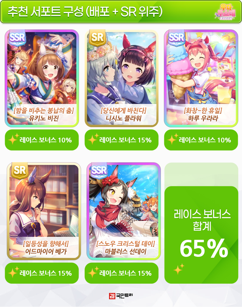 처음에 소개한 것처럼 클라이맥스 시나리오는 레이스 보너스 수치가 매우 중요하다. 해외 서버에선 최소 50~60%를 준비해야 유의미한 결과를 낼 수 있다는 의견이 나온 바 있다. 현재 가장 화젯거리인 서포트 카드를 기준으로 레이스 보너스 구성을 정리했다.