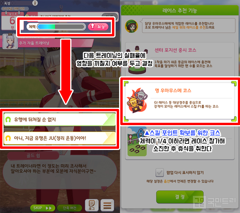 다음으로 최대한 많이 레이스에 참가해 스킬 포인트와 팬 수를 확보한다. 트레이닝을 하다 보면 체력이 애매하게 남을 때가 있는데, 어차피 회복할 거라면 레이스를 뛰어 완전히 비우고 0부터 다시 채우는 게 나을 수 있다. 레이스 종목은 스킬 포인트 확보를 위해 ‘명 우마무스메 코스’를 고르며, 이를 통해 얻는 이득은 두 가지다. 스킬을 많이 배울 수 있고, 팬 수를 빠르게 채워 3년차 때 고유 스킬 레벨을 높이는 것이다.