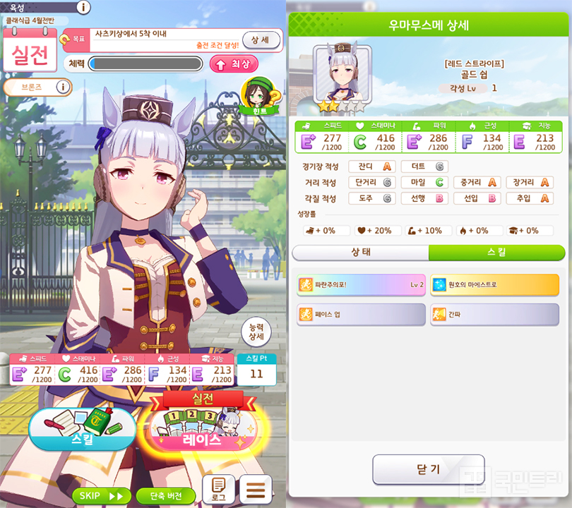 ‘우마무스메’ 캐릭터 ‘골드 쉽’ 육성이 화제다. 미인상이라 여러 우마무스메 중 눈에 띄는 점이 있지만, 오픈 전부터 기상천외한 기행마로 인지도를 높인 것도 빼놓을 수 없다. 게다가 기본 제공 캐릭터라 초보 트레이너들이 흥미를 느끼고 입문 중이다.