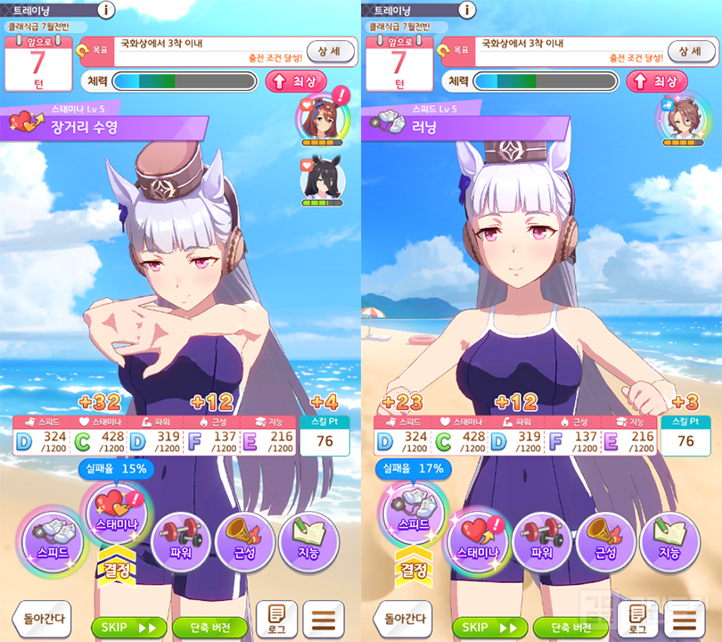 베스트는 ‘훈련 – 지능 or 휴식 – 훈련 – 훈련’이다. 최소 3회 훈련한다고 생각하며, 1, 2번째 훈련 후 남은 체력을 보고 휴식과 지능 훈련 중 고르면 된다. 이 루틴대로 할 경우 스탯 변화는 위 이미지와 같다. 마지막 경기는 장거리 경주이므로 스태미나 위주로 투자했고, 스피드는 우선도를 조금 미뤘다. 그리고 합숙 종료 후 텐노상(가을) 대회까지 2턴이 남아, 이때 스피드와 파워를 보충했다.