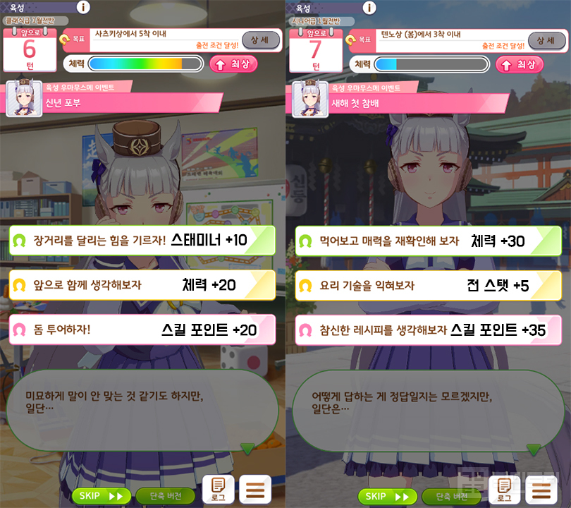 추가로 이듬해 시니어급 1월에는 다른 선택지가 나오고, 순서도 조금 다르니 한 번에 봐두자. 트레이닝이 급한데 체력이 부족하면 1번을 고른다. 음식을 먹는 이벤트는 대부분 체력 회복과 관련이 있으니 기억해두면 된다. 이어 요리 기술을 익히는 2번 선택지는 전 스탯을 조금씩 높이고, 3번은 스킬 포인트를 얻는다. 체력이 부족하다면 1번, 그 외에는 3번을 추천한다.