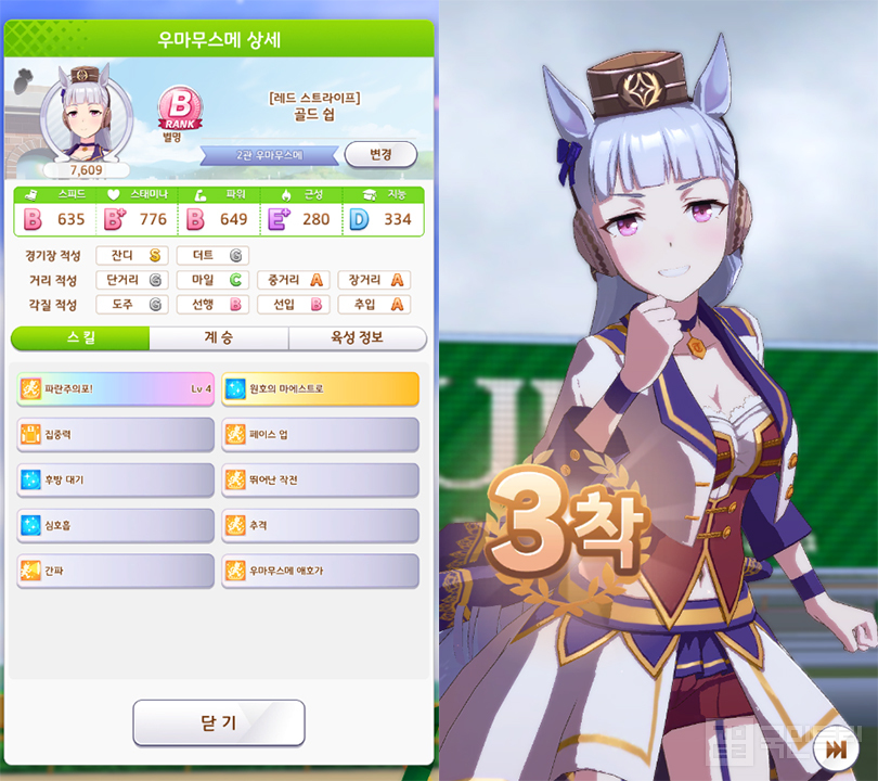 먼저 골드 쉽에 대한 개요다. 서두에서 언급했듯 그녀는 카드, 인자 풀이 쌓인 중, 고수에게는 쉬우나 초보자에게는 제법 난도가 높다. 원인은 포지션이다. ‘장거리 추입마’인데, 우마무스메는 코스가 길고 추입 전략으로 갈수록 육성이 어렵다. 초보자 추천 캐릭터인 ‘사쿠라 바쿠신 오’가 딱 그녀의 정반대인 단거리 도주마니 얼추 이해가 될 것이다.